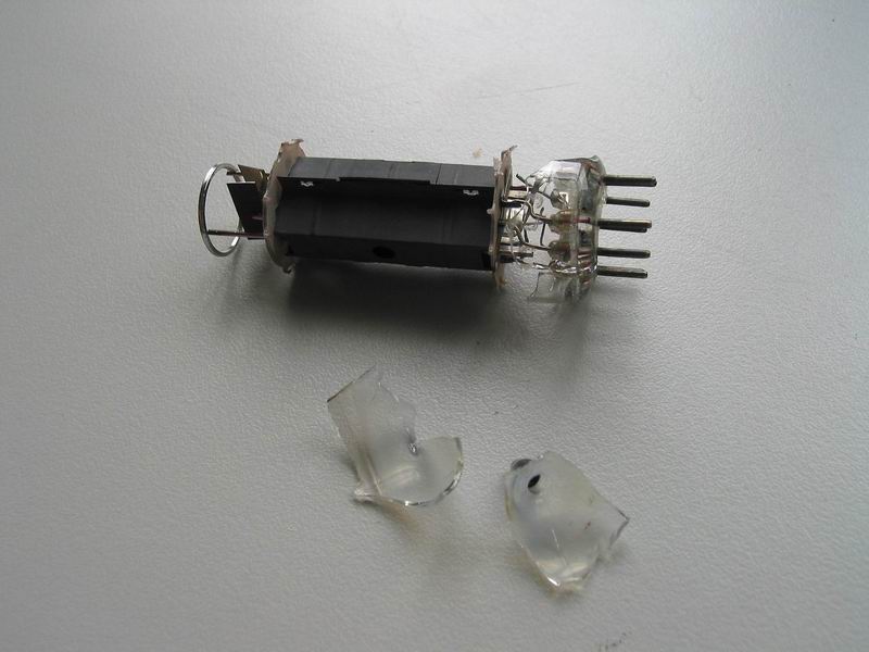 现在打破玻壳,注意吸气剂颜色的变化,换句话说,一旦管子的吸气剂变成这种乳白色,不管玻壳破裂与否这颗管子都没用了。